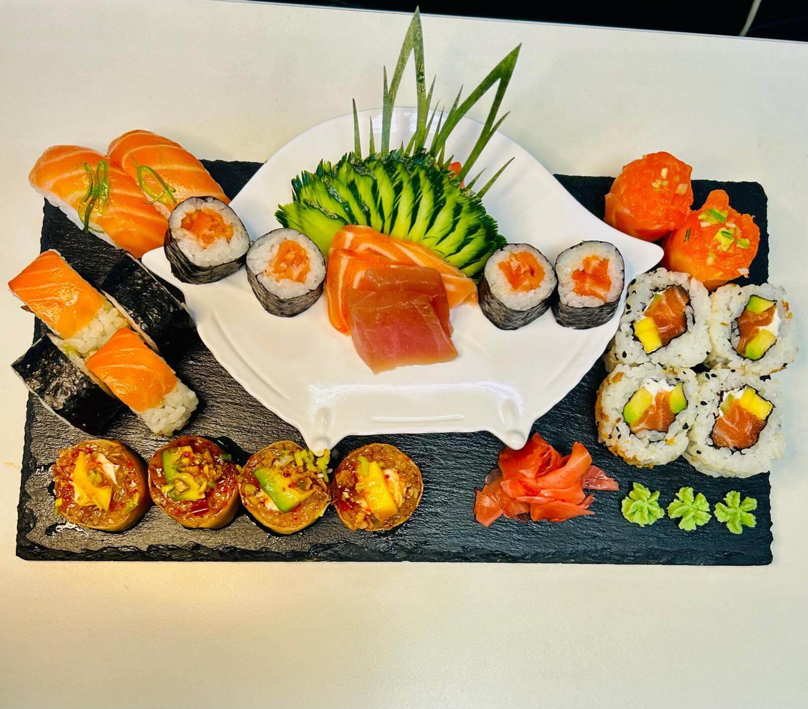 | Sashimi de salmão 2 unidades, sashimi de atum 2 unidades, neguiri de salmão 2 unidades, gunkan de salmão 2 unidades, uramaki de salmão especial 2 unidades, uramaki de camarão 2 unidades, uramaki de salmão 2 unidades, fotomaki espacial 2 unidades, hot roll primavera 4 uni e hosamaki 4 unidades. |